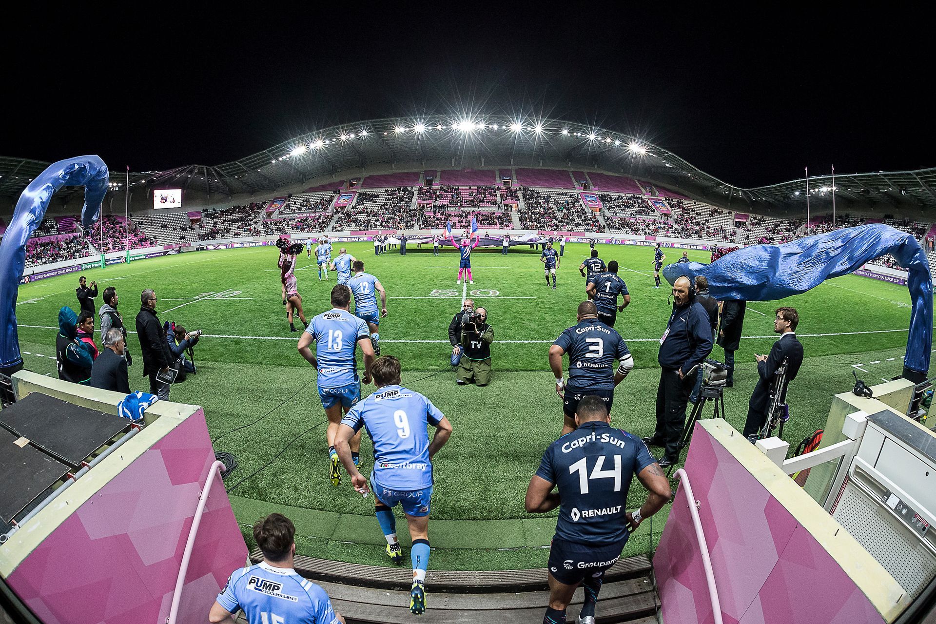 Entrée sur la pelouse des gladiateurs rugbymen prêt à relever le défi d'un engagement total