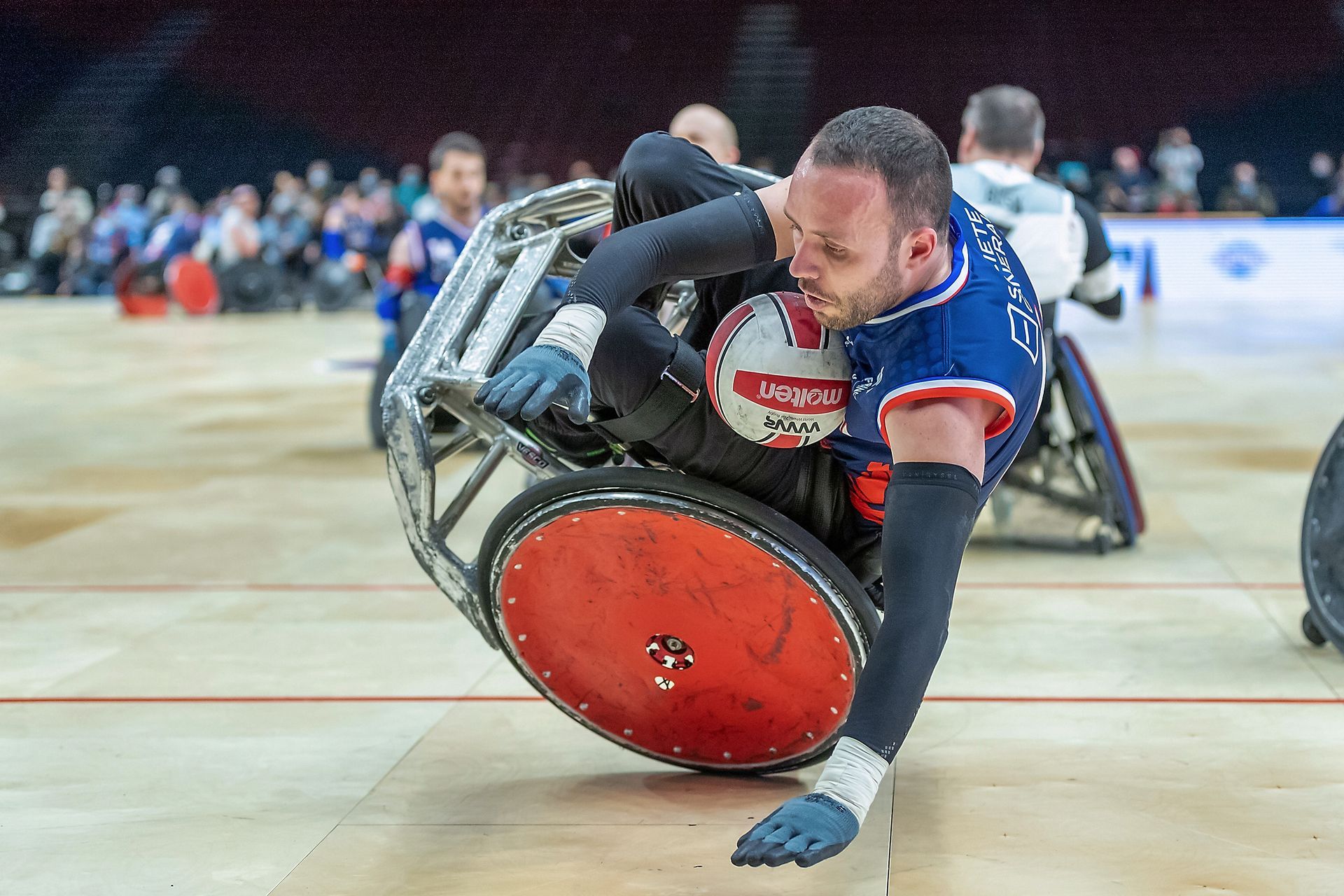 Chute au championnat européen de rugby fauteuil montrant l'engagement total des joueurs passionnés