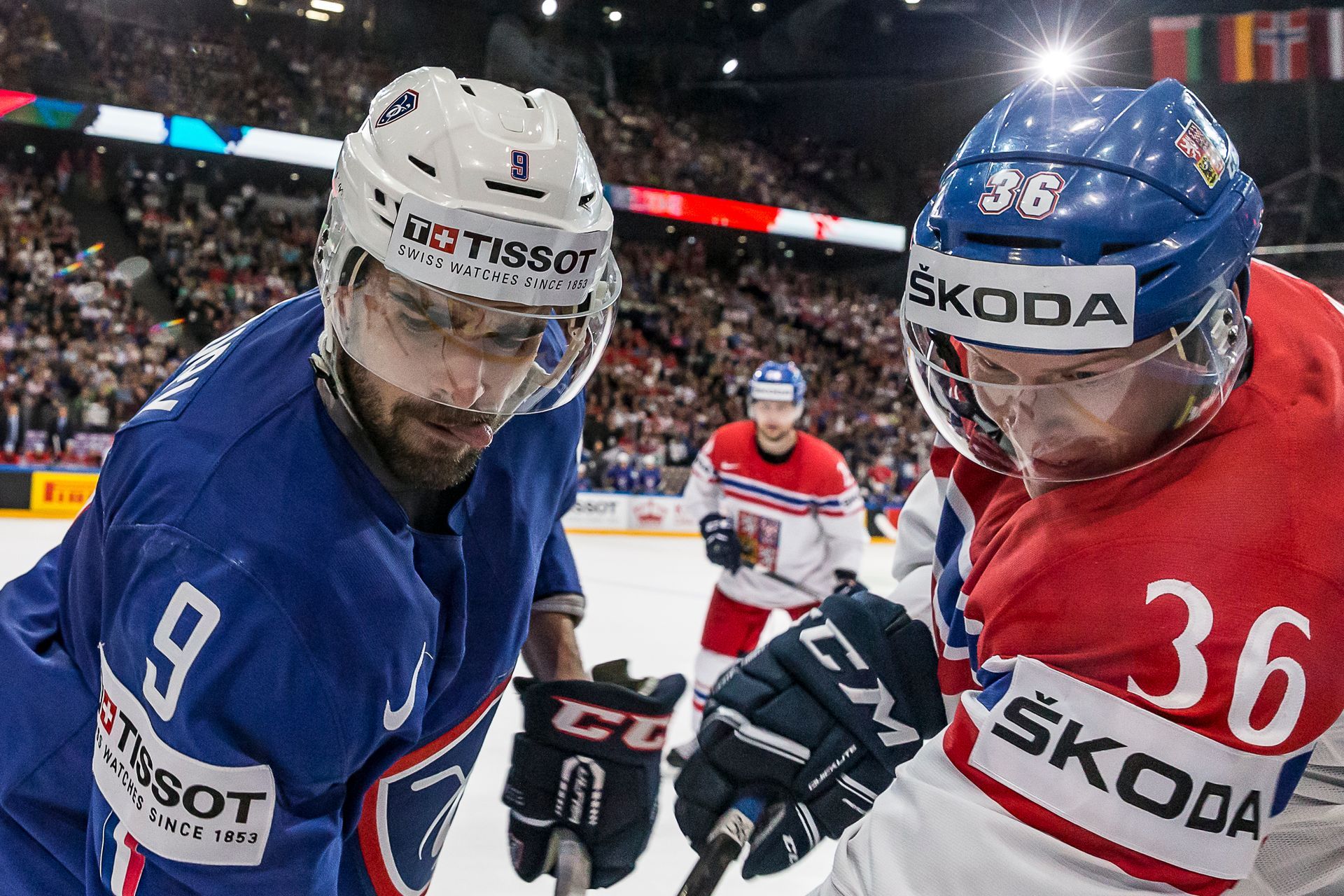 Langue sortie montrant la technicité et l'engagement du hockeyeur français à la coupe du monde de Hockey contre la République Tchèque.