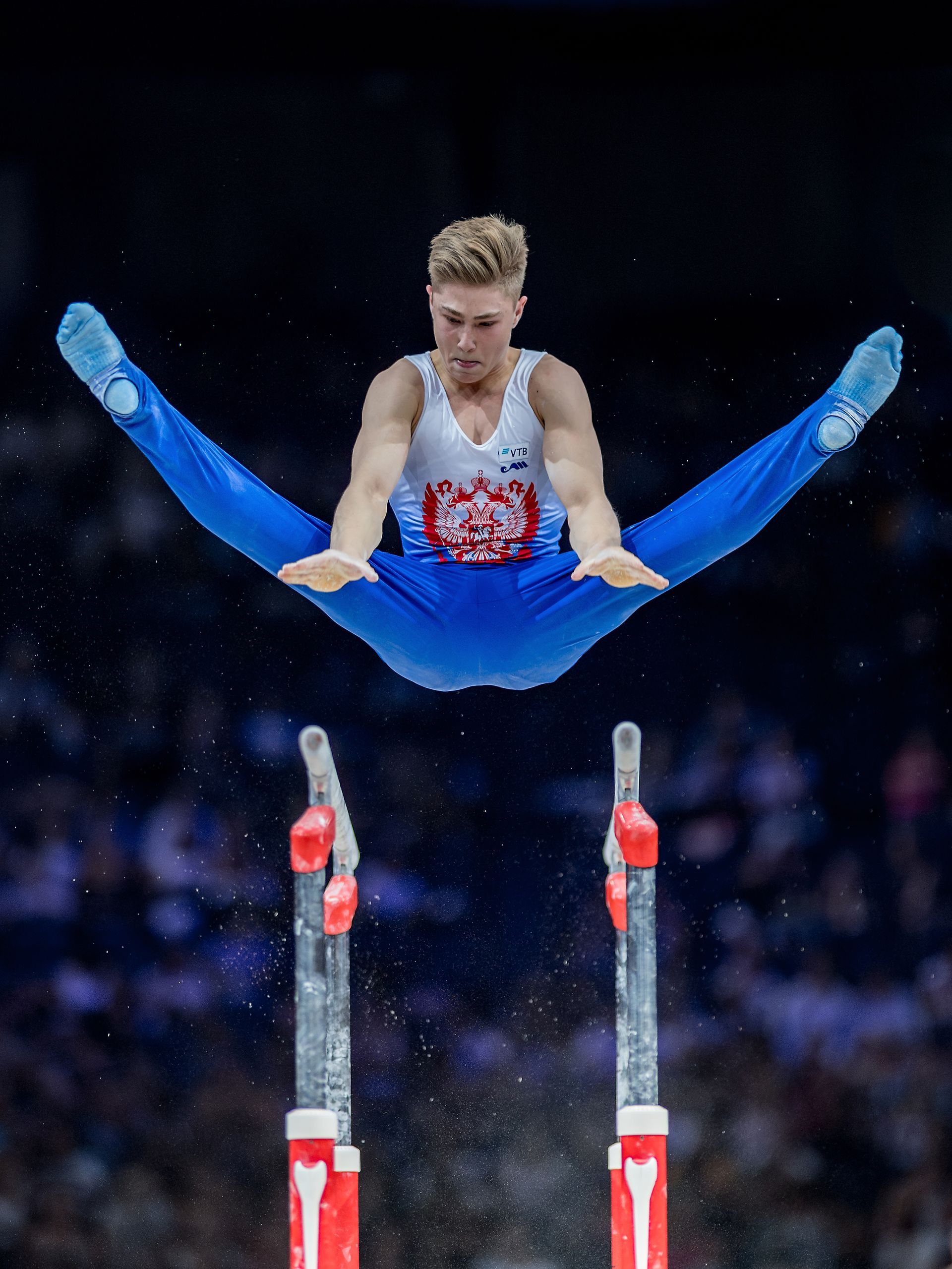 Symétrie parfaite d'un geste de très haut niveau au barres parallèles. Image épurée et graphique témoignant de la pureté des gestes exécutées à la perfection. Photo capturée lors des internationaux de Gymnastique de Paris.