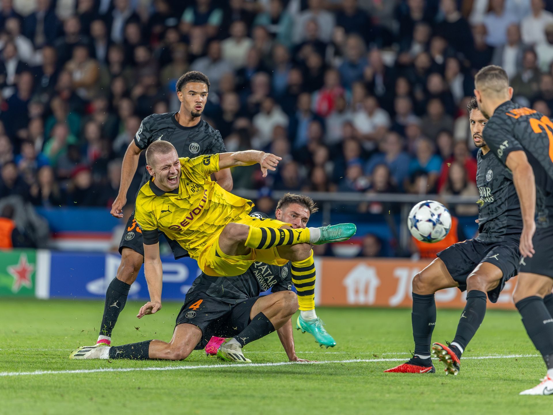 Engagement total du joueur de Dortmund face au PSG dans cette phase de jeu intense. Le visage grimaçant témoigne de sa volonté et de son implication totale pour arriver à marquer un but pour arracher la victoire.