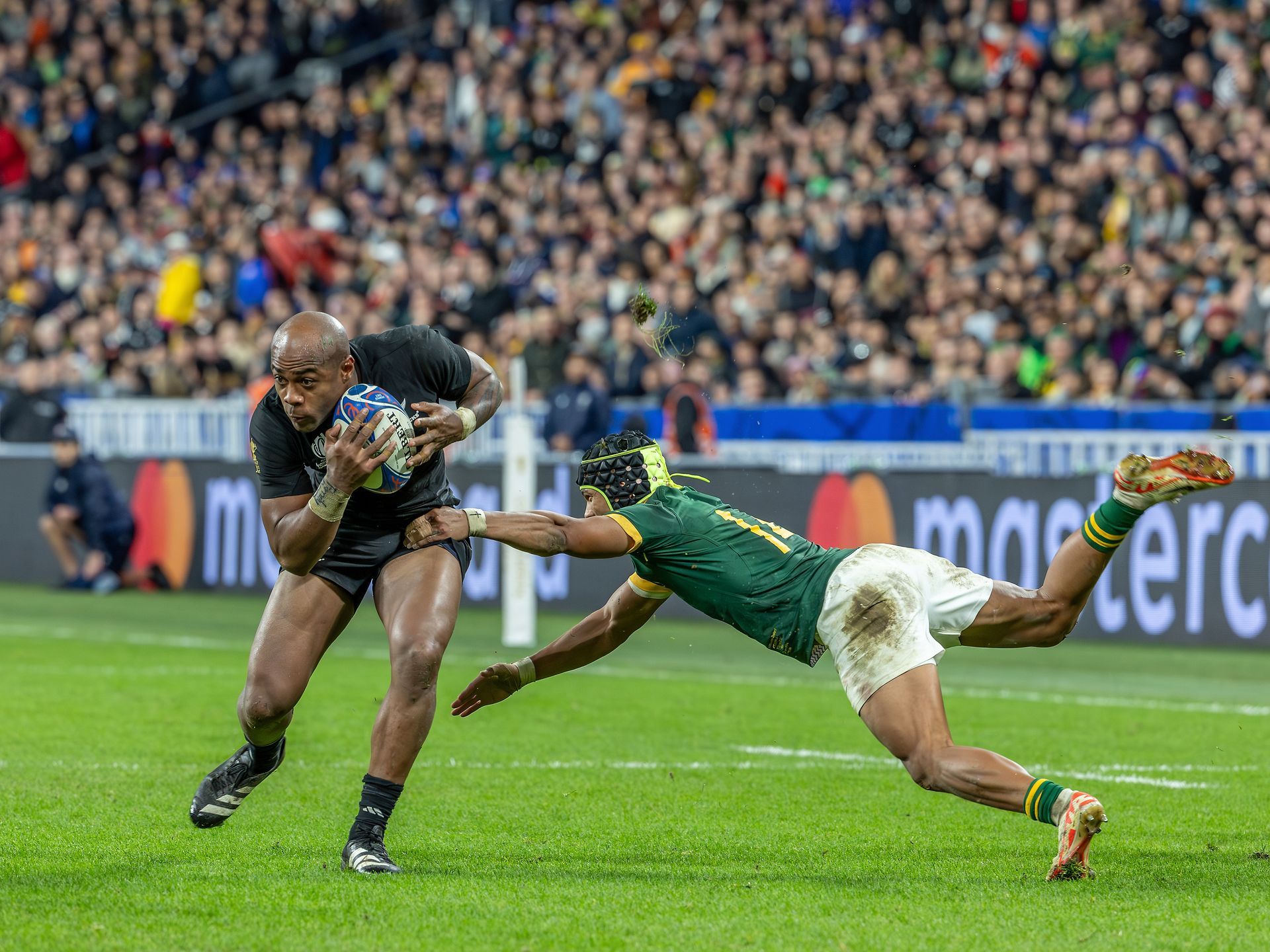 Duel important lors de la finale de la Coupe du Monde de rugby entre la Nouvelle Zélande et l'Afrique du sud. Cette photo témoigne de l'implication totale des joueurs et de la puissance des gestes.