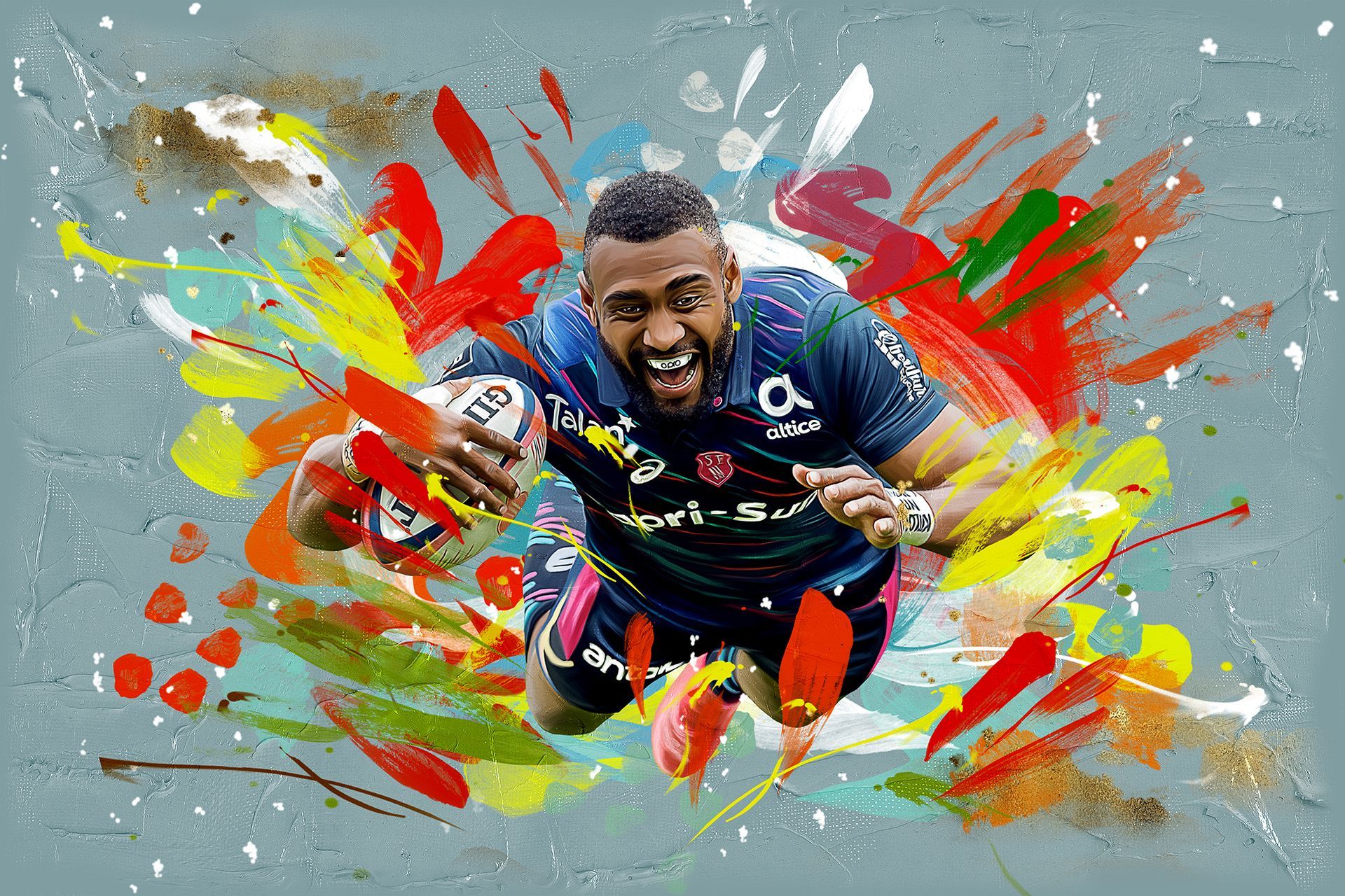 Cri de joie intemporel d'un joueur de rugby sautant pour aplatir un essai.
